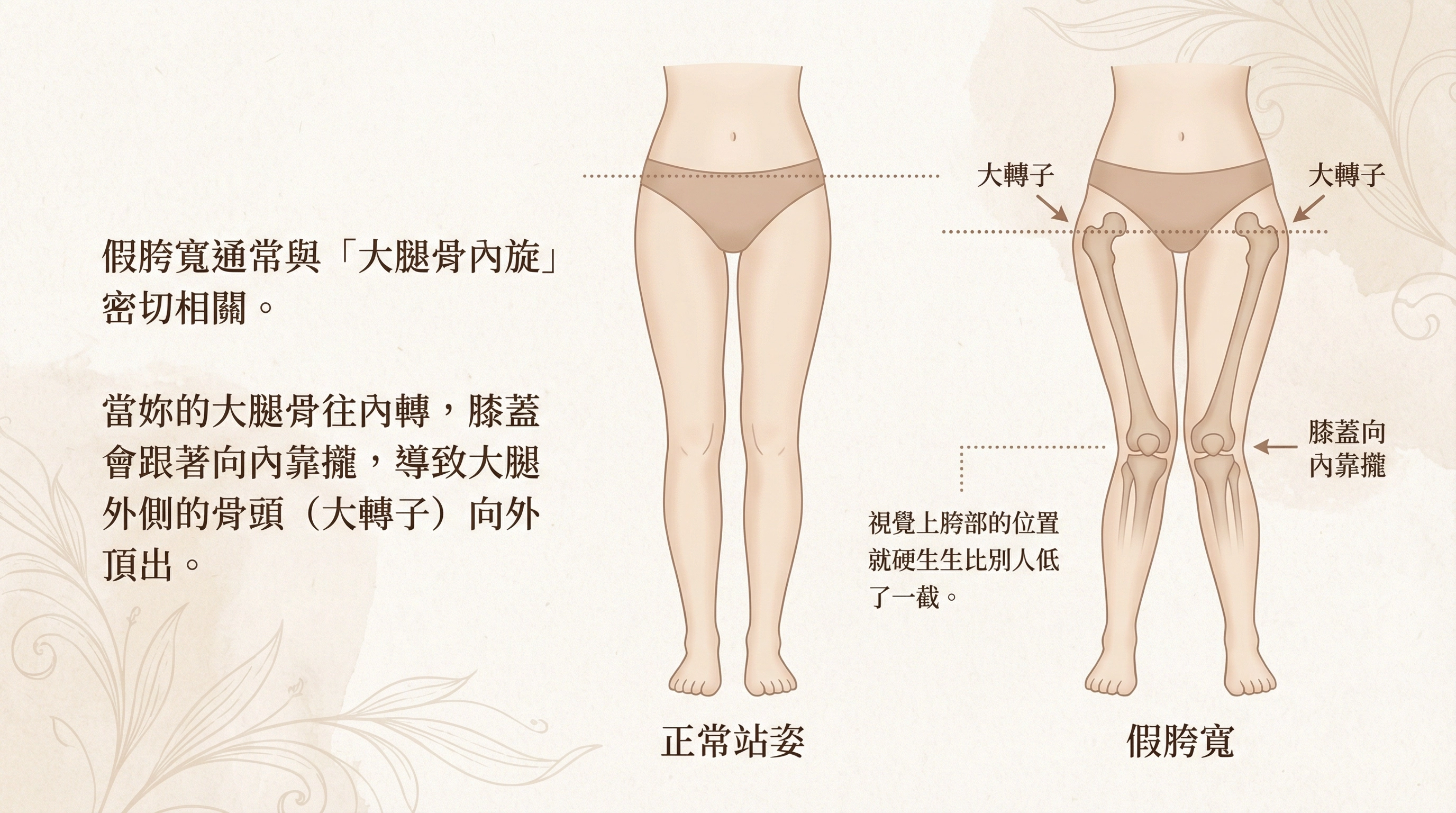 根據 《臨床解剖學》(Clinical Anatomy) 的研究,假胯寬通常與「 大腿骨內旋 」密切相關。
